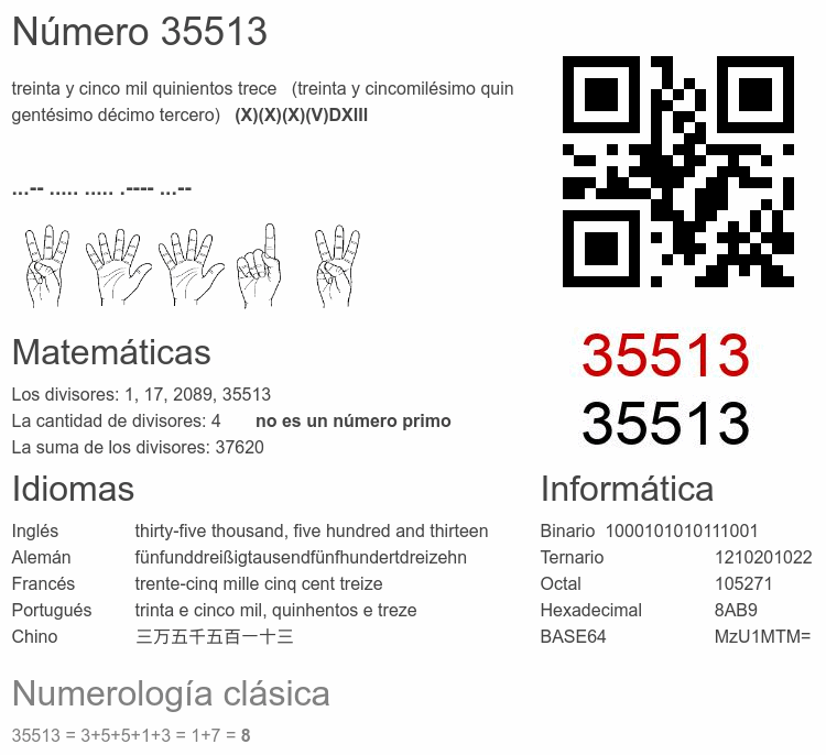 Si conoce algo interesante sobre el número 35513 o cualquier número natural (entero positivo), por favor escríbanos.Número 35 513 en otras unidades