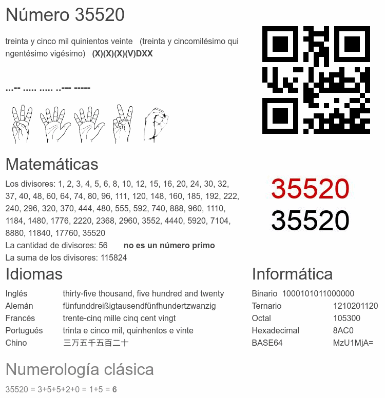 Si conoce algo interesante sobre el número 35520 que no ha encontrado en esta página, no dude en escríbanos aqui.