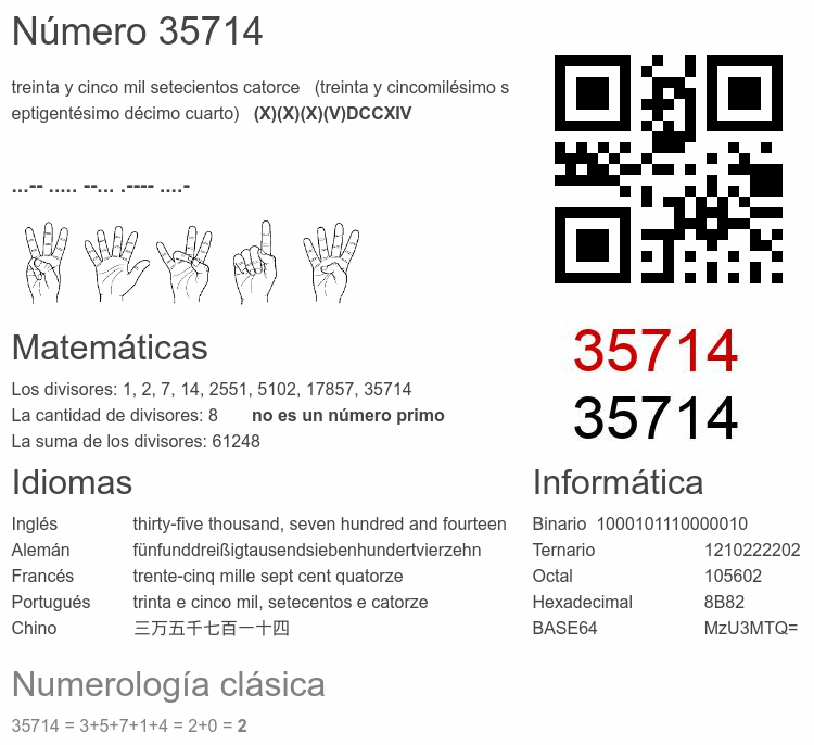 Si conoce algo interesante sobre el número 35714 o cualquier número natural (entero positivo), por favor escríbanos.Número 35 714 en otras unidades