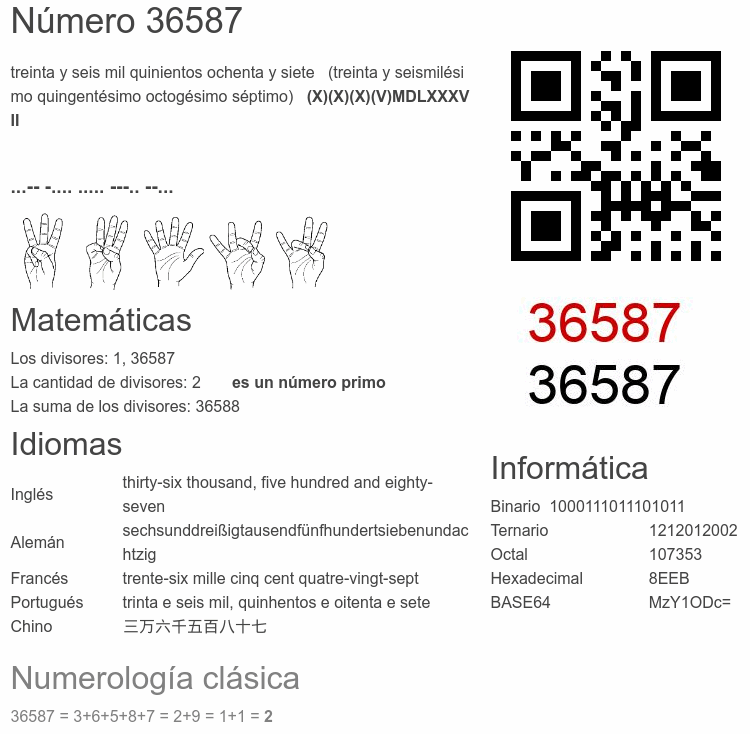 Si conoce algo interesante sobre el número 36587 o cualquier número natural (entero positivo), por favor escríbanos.Número 36 587 en otras unidades