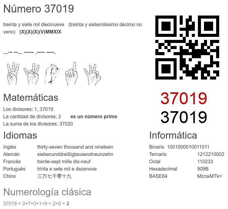 Si conoce algo interesante sobre el número 37019 o cualquier número natural (entero positivo), por favor escríbanos.Número 37 019 en otras unidades
