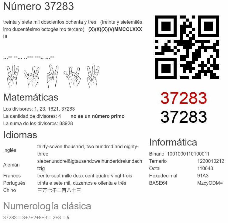 Número 37283 en el código morse: ...-- --... ..--- ---.. ...--Lengua de Signos Española 37283:
