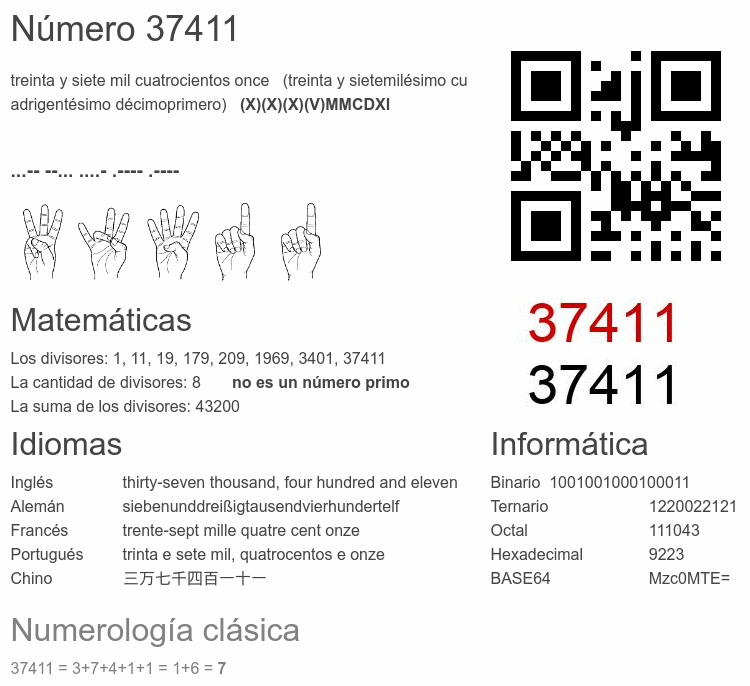 | Portugués: | 🔊 (número 37 411) | trinta e sete mil, quatrocentos e onze |