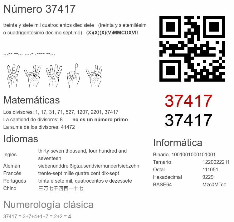 Si conoce algo interesante sobre el número 37417 que no ha encontrado en esta página, no dude en escríbanos aqui.