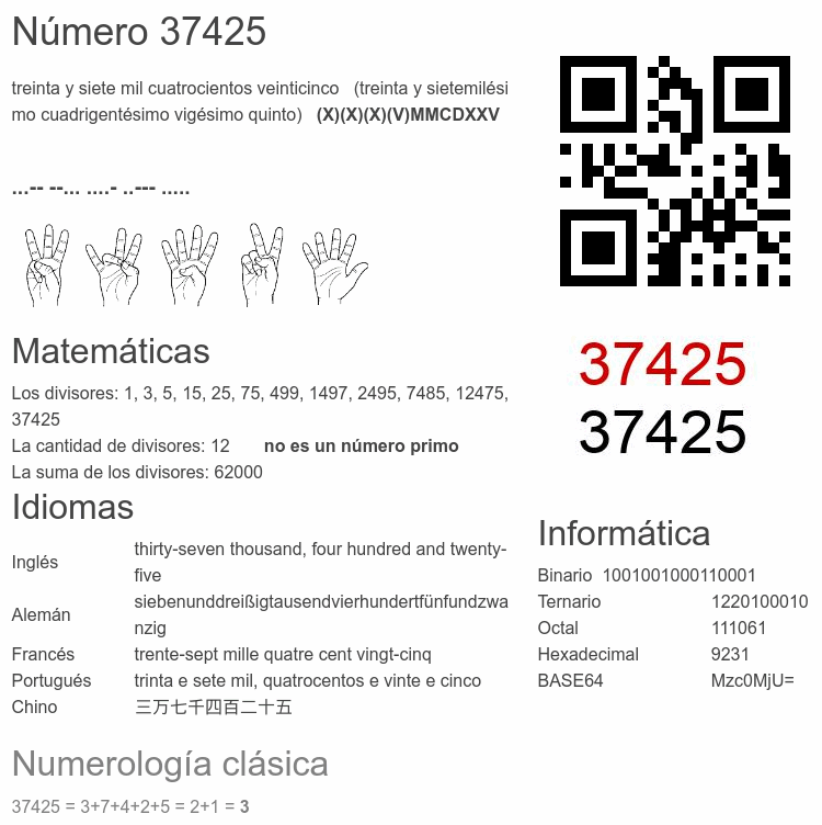 Si conoce algo interesante sobre el número 37425 o cualquier número natural (entero positivo), por favor escríbanos.Número 37 425 en otras unidades
