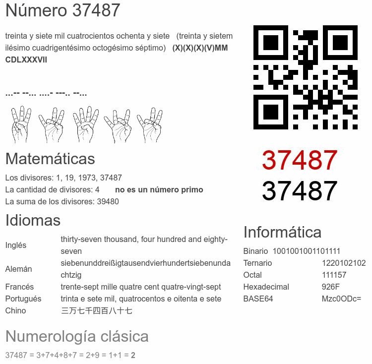 Si conoce algo interesante sobre el número 37487 o cualquier número natural (entero positivo), por favor escríbanos.Número 37 487 en otras unidades