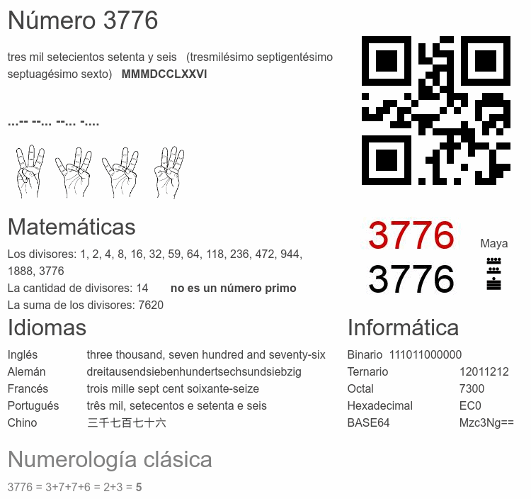 Si conoce algo interesante sobre el número 3776 o cualquier número natural (entero positivo), por favor escríbanos.Número 3 776 en otras unidades