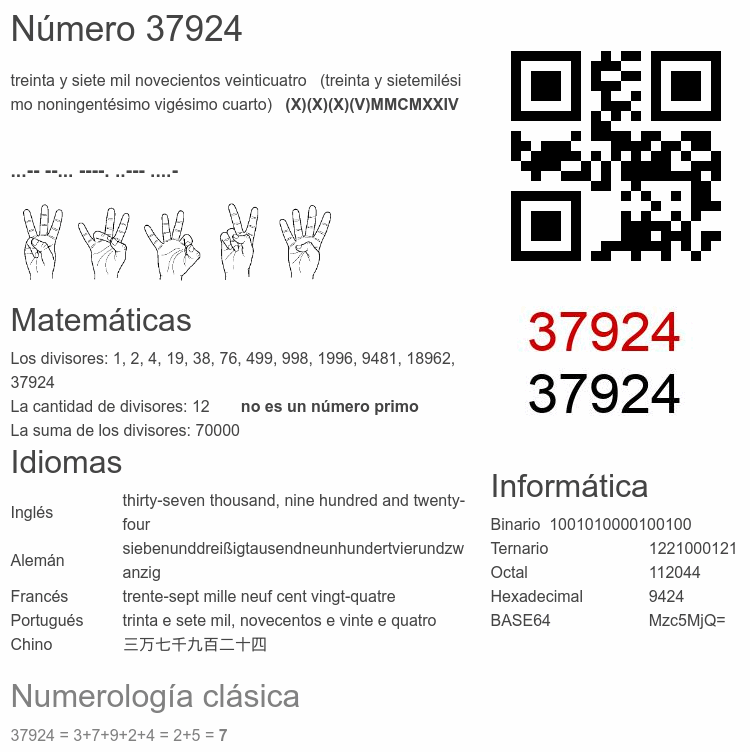 El número par 37 924 se dice 🔊, y se escribe con las palabras: treinta y siete mil novecientos veinticuatro. El número ordinal 37924.° se dice 🔊 y se escribe como: treinta y sietemilésimo noningentésimo vigésimo cuarto. El significado del número 37924 en Matemáticas: Es un primo? Factorización y árbol de factores primos. La raíz cuadrada de y la raíz cúbica de 37924. El significado en informática, numerología, códigos e imágenes, escritura y denominación en otras lenguas. Otras curiosidades relacionadas con el 37924.