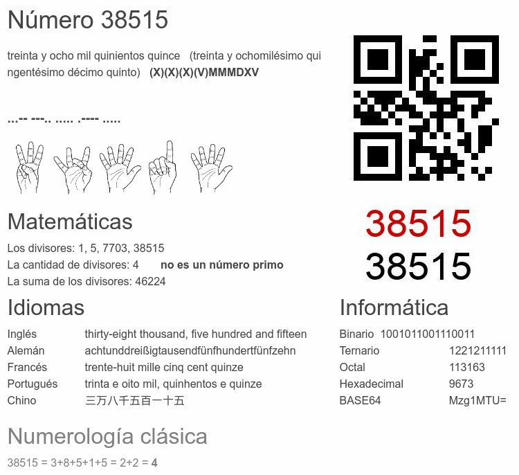 Si conoce algo interesante sobre el número 38515 o cualquier número natural (entero positivo), por favor escríbanos.Número 38 515 en otras unidades
