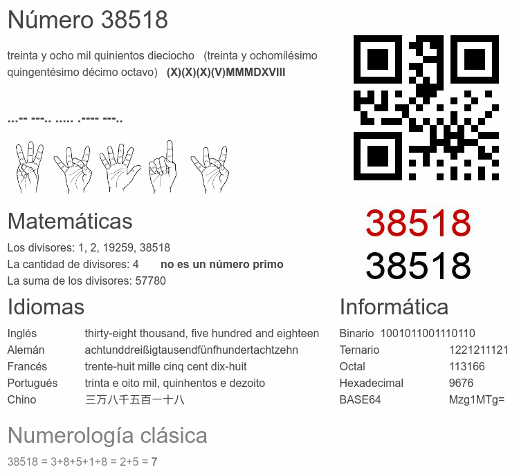 Si conoce algo interesante sobre el número 38518 o cualquier número natural (entero positivo), por favor escríbanos.Número 38 518 en otras unidades