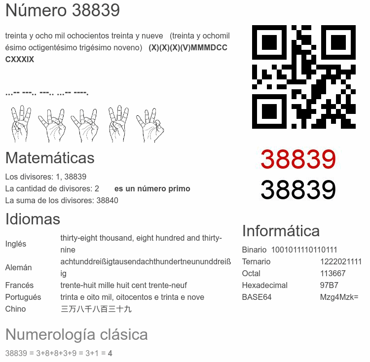 El numero 38839 es un número primo. Los números primos más cercanos son 38833, 38851.