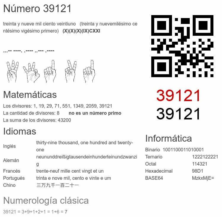 Si conoce algo interesante sobre el número 39121 o cualquier número natural (entero positivo), por favor escríbanos.Número 39 121 en otras unidades