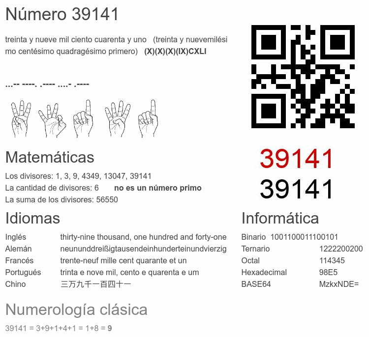 El número impar 39 141 se dice 🔊, y se escribe con las palabras: treinta y nueve mil ciento cuarenta y uno. El número ordinal 39141.° se dice 🔊 y se escribe como: treinta y nuevemilésimo centésimo quadragésimo primero. El significado del número 39141 en Matemáticas: Es un primo? Factorización y árbol de factores primos. La raíz cuadrada de y la raíz cúbica de 39141. El significado en informática, numerología, códigos e imágenes, escritura y denominación en otras lenguas. Otras curiosidades relacionadas con el 39141.