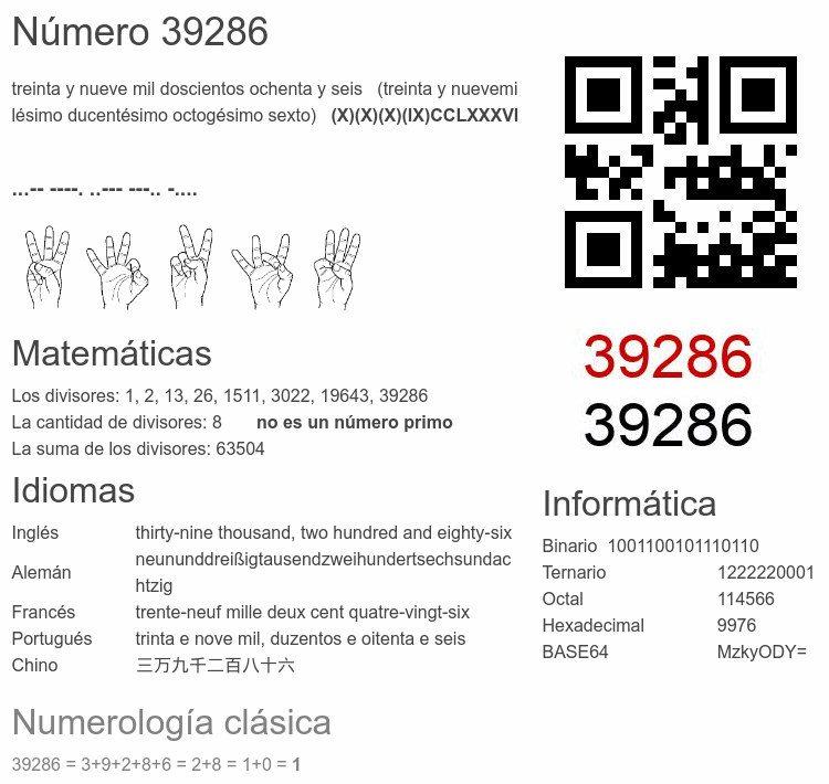 Si conoce algo interesante sobre el número 39286 o cualquier número natural (entero positivo), por favor escríbanos.Número 39 286 en otras unidades