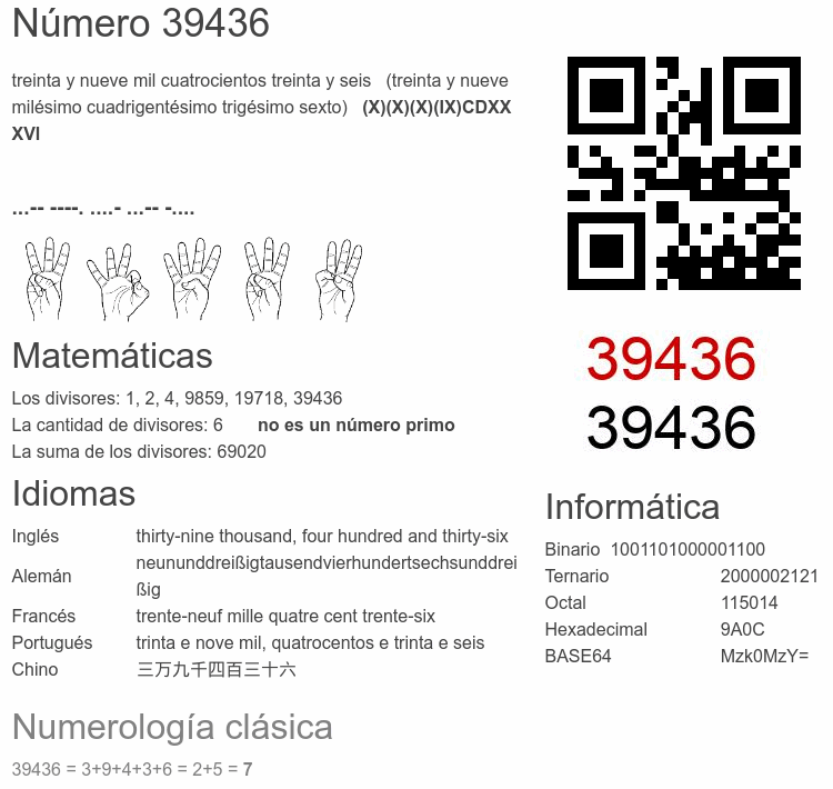 Si conoce algo interesante sobre el número 39436 o cualquier número natural (entero positivo), por favor escríbanos.Número 39 436 en otras unidades