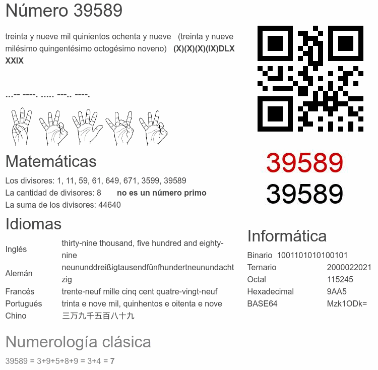 Si conoce algo interesante sobre el número 39589 o cualquier número natural (entero positivo), por favor escríbanos.Número 39 589 en otras unidades