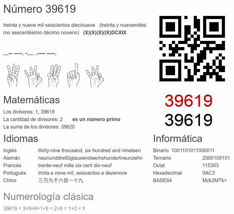Si conoce algo interesante sobre el número 39619 o cualquier número natural (entero positivo), por favor escríbanos.Número 39 619 en otras unidades