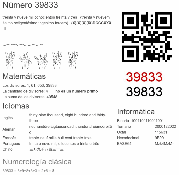 Si conoce algo interesante sobre el número 39833 o cualquier número natural (entero positivo), por favor escríbanos.Número 39 833 en otras unidades