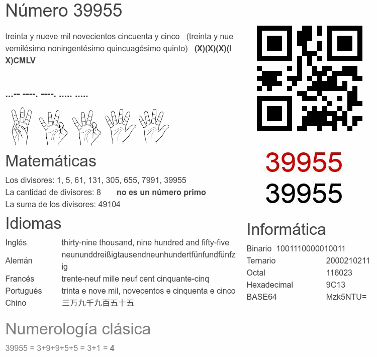 Si conoce algo interesante sobre el número 39955 o cualquier número natural (entero positivo), por favor escríbanos.Número 39 955 en otras unidades