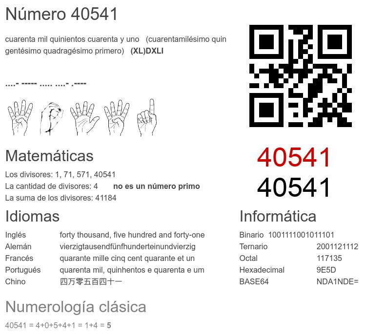 Si conoce algo interesante sobre el número 40541 o cualquier número natural (entero positivo), por favor escríbanos.Número 40 541 en otras unidades