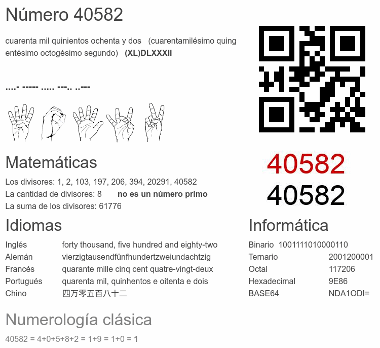 Si conoce algo interesante sobre el número 40582 o cualquier número natural (entero positivo), por favor escríbanos.Número 40 582 en otras unidades