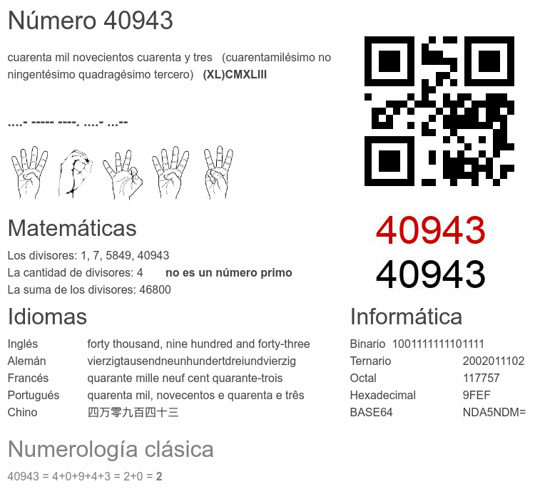 Si conoce algo interesante sobre el número 40943 o cualquier número natural (entero positivo), por favor escríbanos.Número 40 943 en otras unidades