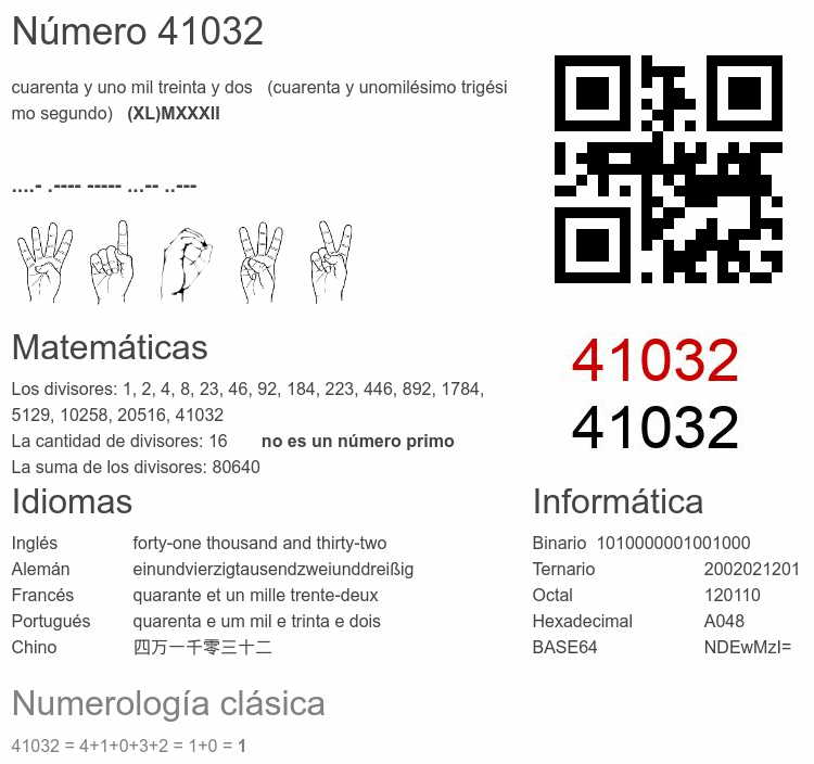 Si conoce algo interesante sobre el número 41032 o cualquier número natural (entero positivo), por favor escríbanos.Número 41 032 en otras unidades