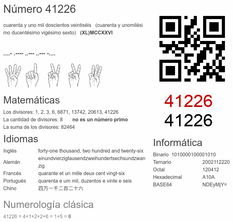 | Portugués: | 🔊 (número 41 226) | quarenta e um mil, duzentos e vinte e seis |