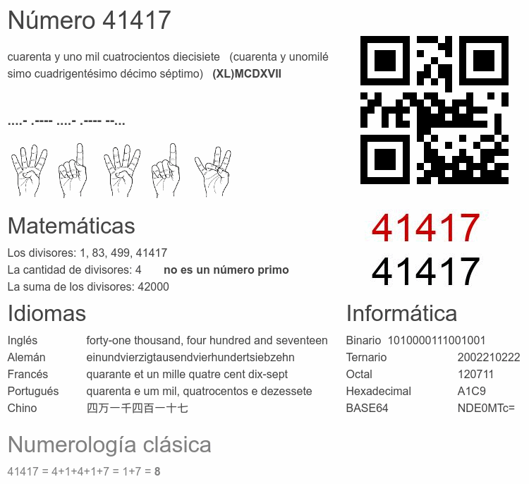 Si conoce algo interesante sobre el número 41417 o cualquier número natural (entero positivo), por favor escríbanos.Número 41 417 en otras unidades
