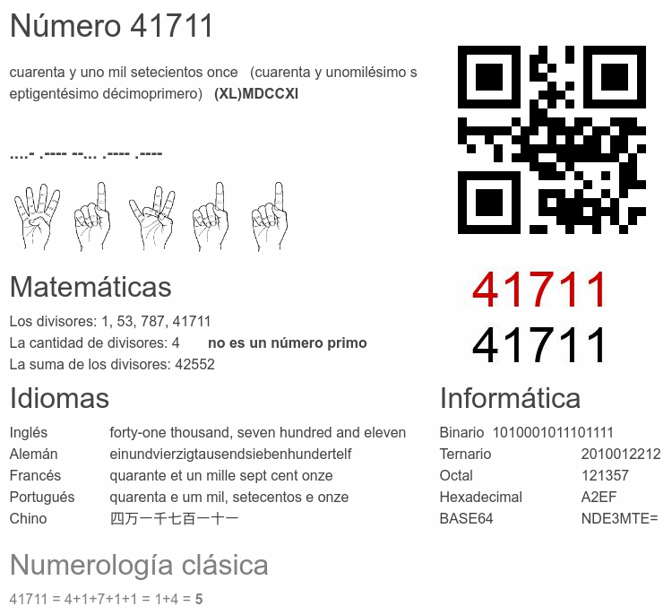 | Francés: | 🔊 (nombre 41 711) | quarante et un mille sept cent onze |
