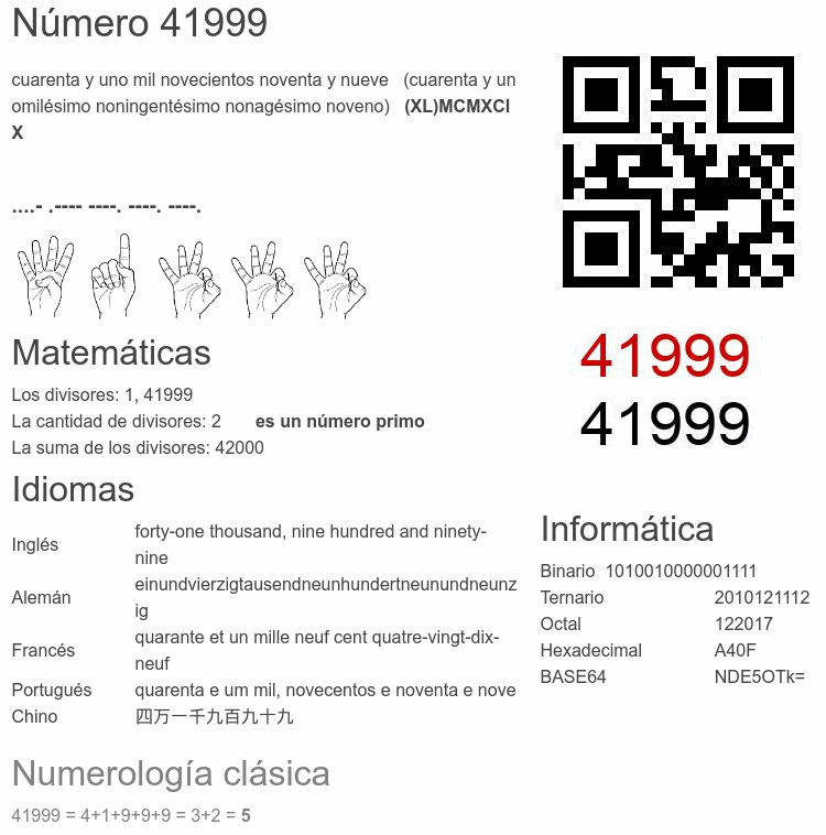 Si conoce algo interesante sobre el número 41999 o cualquier número natural (entero positivo), por favor escríbanos.Número 41 999 en otras unidades