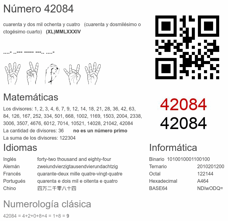 Si conoce algo interesante sobre el número 42084 o cualquier número natural (entero positivo), por favor escríbanos.Número 42 084 en otras unidades