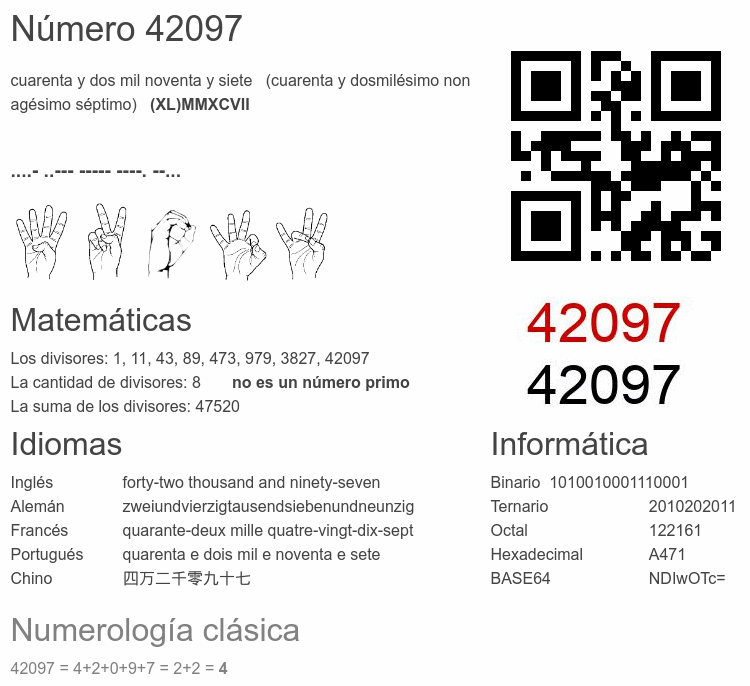 El número impar 42 097 se dice 🔊, y se escribe con las palabras: cuarenta y dos mil noventa y siete. El número ordinal 42097.° se dice 🔊 y se escribe como: cuarenta y dosmilésimo nonagésimo séptimo. El significado del número 42097 en Matemáticas: Es un primo? Factorización y árbol de factores primos. La raíz cuadrada de y la raíz cúbica de 42097. El significado en informática, numerología, códigos e imágenes, escritura y denominación en otras lenguas. Otras curiosidades relacionadas con el 42097.