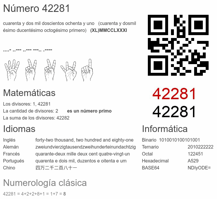 Si conoce algo interesante sobre el número 42281 o cualquier número natural (entero positivo), por favor escríbanos.Número 42 281 en otras unidades