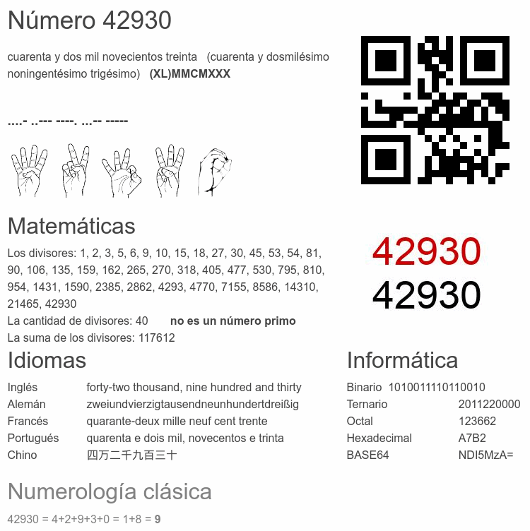 Si conoce algo interesante sobre el número 42930 o cualquier número natural (entero positivo), por favor escríbanos.Número 42 930 en otras unidades
