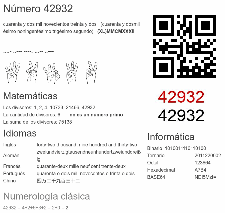 El número par 42 932 se dice 🔊, y se escribe con las palabras: cuarenta y dos mil novecientos treinta y dos. El número ordinal 42932.° se dice 🔊 y se escribe como: cuarenta y dosmilésimo noningentésimo trigésimo segundo. El significado del número 42932 en Matemáticas: Es un primo? Factorización y árbol de factores primos. La raíz cuadrada de y la raíz cúbica de 42932. El significado en informática, numerología, códigos e imágenes, escritura y denominación en otras lenguas. Otras curiosidades relacionadas con el 42932.