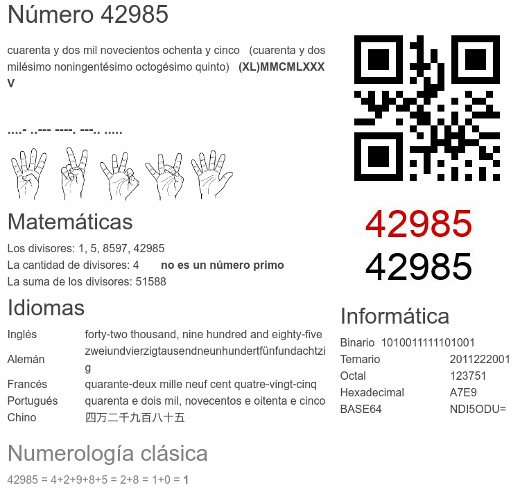 Si conoce algo interesante sobre el número 42985 o cualquier número natural (entero positivo), por favor escríbanos.Número 42 985 en otras unidades
