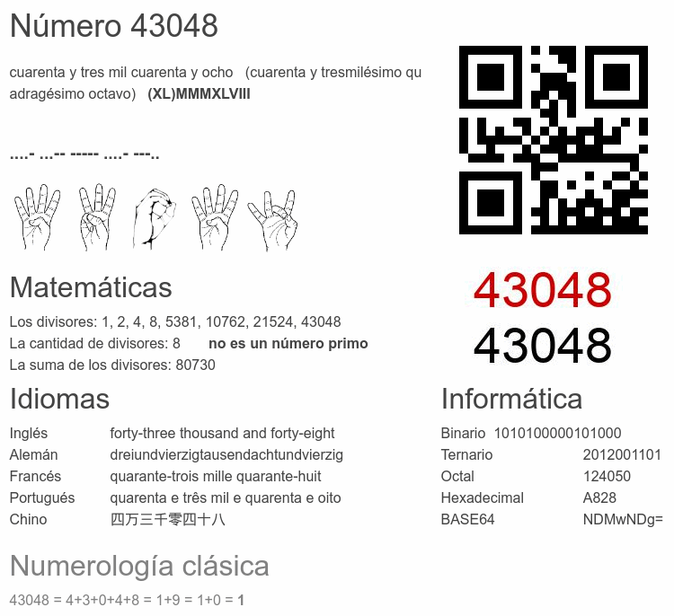 Si conoce algo interesante sobre el número 43048 o cualquier número natural (entero positivo), por favor escríbanos.Número 43 048 en otras unidades