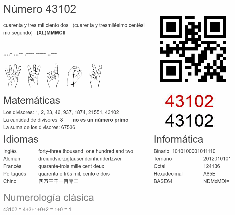 Si conoce algo interesante sobre el número 43102 o cualquier número natural (entero positivo), por favor escríbanos.Número 43 102 en otras unidades