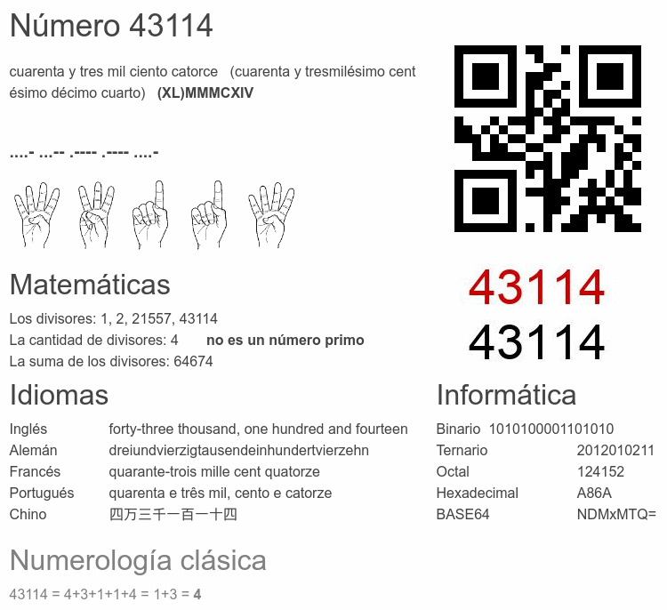 El número par 43 114 se dice 🔊, y se escribe con las palabras: cuarenta y tres mil ciento catorce. El número ordinal 43114.° se dice 🔊 y se escribe como: cuarenta y tresmilésimo centésimo décimo cuarto. El significado del número 43114 en Matemáticas: Es un primo? Factorización y árbol de factores primos. La raíz cuadrada de y la raíz cúbica de 43114. El significado en informática, numerología, códigos e imágenes, escritura y denominación en otras lenguas. Otras curiosidades relacionadas con el 43114.