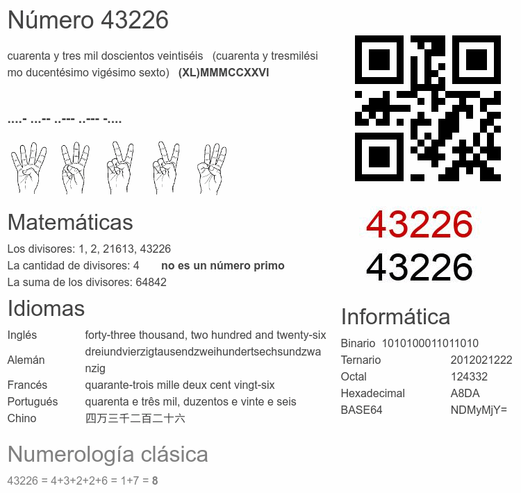 Si conoce algo interesante sobre el número 43226 o cualquier número natural (entero positivo), por favor escríbanos.Número 43 226 en otras unidades
