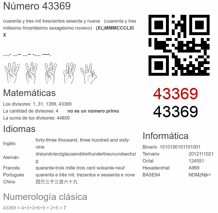 Si conoce algo interesante sobre el número 43369 o cualquier número natural (entero positivo), por favor escríbanos.Número 43 369 en otras unidades