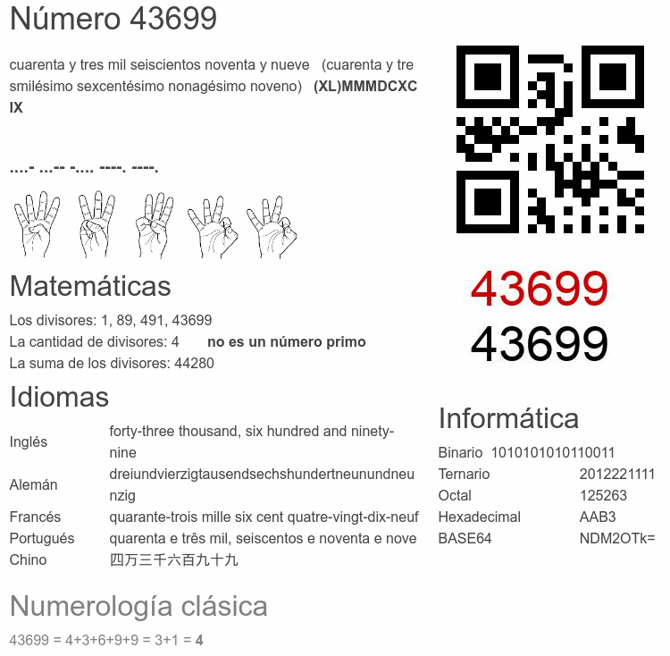| Portugués: | 🔊 (número 43 699) | quarenta e três mil, seiscentos e noventa e nove |