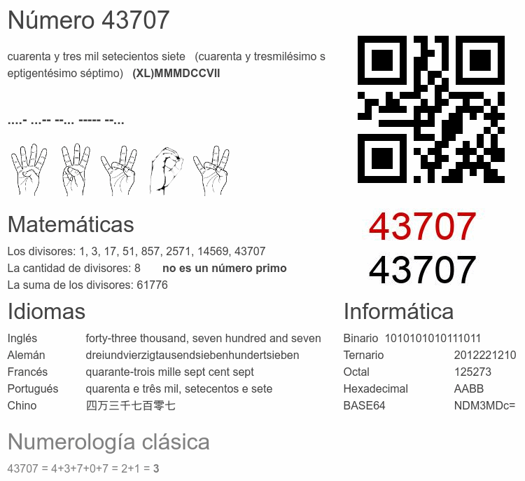 Si conoce algo interesante sobre el número 43707 o cualquier número natural (entero positivo), por favor escríbanos.Número 43 707 en otras unidades