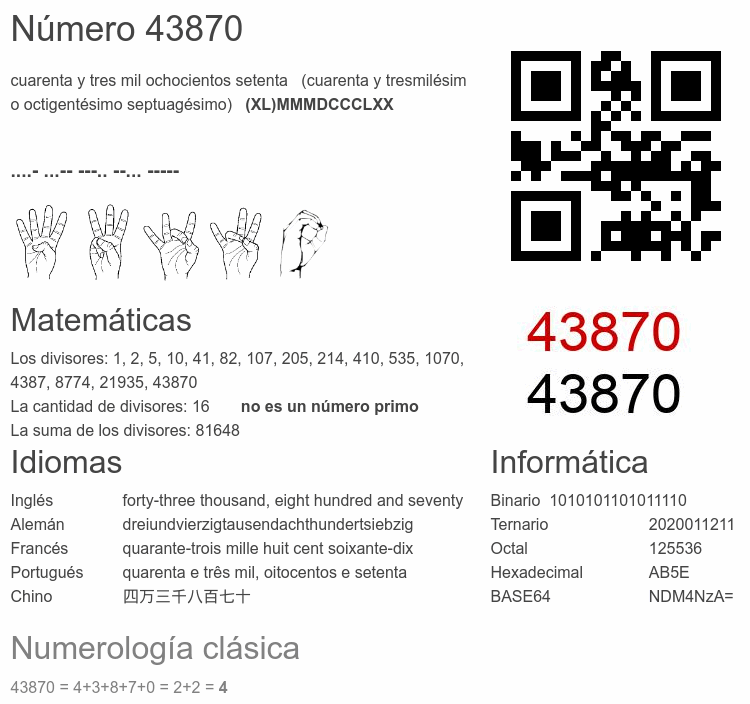 | Portugués: | 🔊 (número 43 870) | quarenta e três mil, oitocentos e setenta |