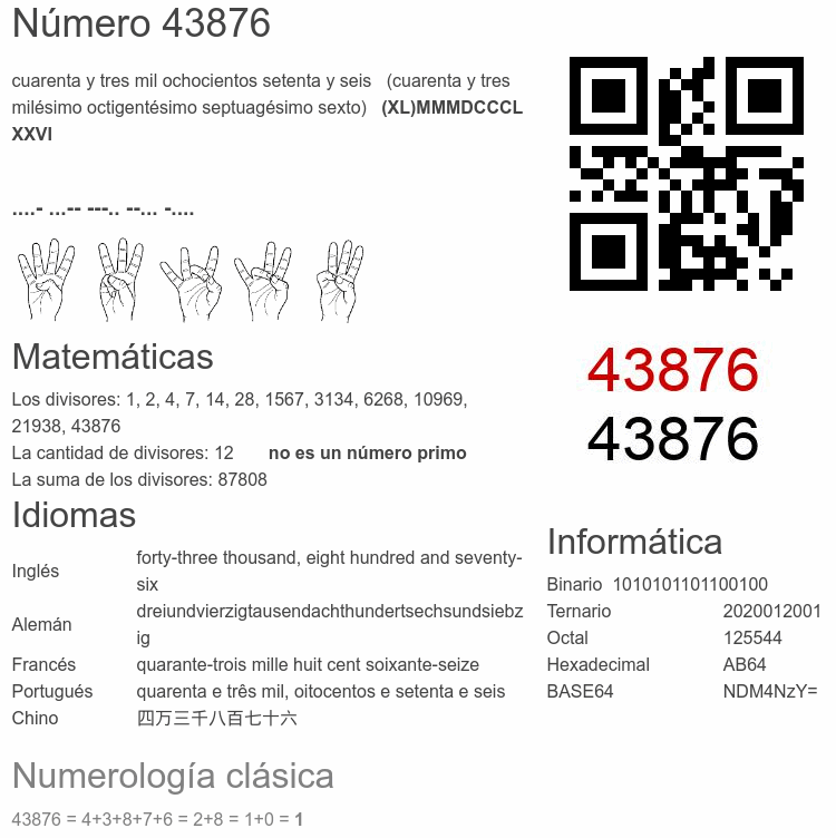 El número par 43 876 se dice 🔊, y se escribe con las palabras: cuarenta y tres mil ochocientos setenta y seis. El número ordinal 43876.° se dice 🔊 y se escribe como: cuarenta y tresmilésimo octigentésimo septuagésimo sexto. El significado del número 43876 en Matemáticas: Es un primo? Factorización y árbol de factores primos. La raíz cuadrada de y la raíz cúbica de 43876. El significado en informática, numerología, códigos e imágenes, escritura y denominación en otras lenguas. Otras curiosidades relacionadas con el 43876.