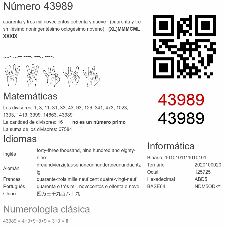 Si conoce algo interesante sobre el número 43989 o cualquier número natural (entero positivo), por favor escríbanos.Número 43 989 en otras unidades