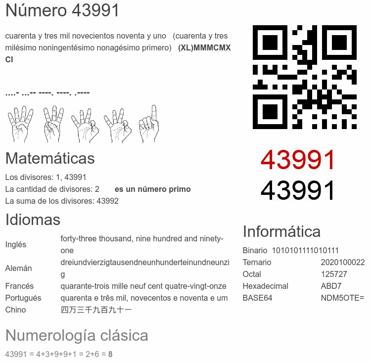 Si conoce algo interesante sobre el número 43991 o cualquier número natural (entero positivo), por favor escríbanos.Número 43 991 en otras unidades