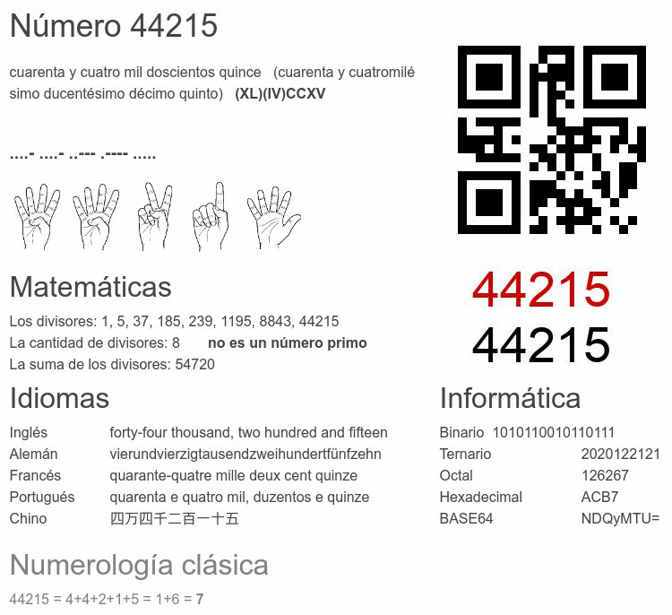 El número impar 44 215 se dice 🔊, y se escribe con las palabras: cuarenta y cuatro mil doscientos quince. El número ordinal 44215.° se dice 🔊 y se escribe como: cuarenta y cuatromilésimo ducentésimo décimo quinto. El significado del número 44215 en Matemáticas: Es un primo? Factorización y árbol de factores primos. La raíz cuadrada de y la raíz cúbica de 44215. El significado en informática, numerología, códigos e imágenes, escritura y denominación en otras lenguas. Otras curiosidades relacionadas con el 44215.