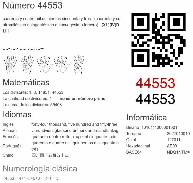 Si conoce algo interesante sobre el número 44553 o cualquier número natural (entero positivo), por favor escríbanos.Número 44 553 en otras unidades